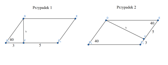 W tym zadaniu oblicz pole danego równoległoboku wiedząc, że jego wysokość poprowadzona z jednego z wierzchołków podzieliła bok równoległoboku na odcinki o długościach 3 cm i 5 cm, a kąt ostry równoległoboku ma miarę 40°.