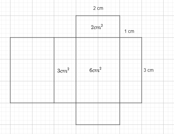 P = 2 · (3 cm · 2 cm + 2 cm · 1 cm + 3 cm · 1 cm) = 2 · (6 cm2 + 2 cm2 + 3 cm2) = 2 · 11 cm2 = 22 cm2