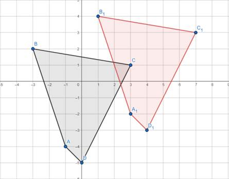 Narysuj w układzie współrzędnych czworokąt, którego wierzchołki znajdują się w punktach A=(-1,-4), B=(-3,2), C=(3,1), D=(0,-5). Następnie przesuń każdy wierzchołek czworokąta o 4 jednostki w prawo i 2 jednostki w górę. Połącz nowe punkty, aby utworzyć nowy czworokąt. Sprawdź, czy ten nowy czworokąt jest przystający do czworokąta ABCD.