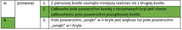 | A. | ponieważ | 1. | Z pierwszej kostki usunięto mniejszy sześcian niż z drugiej kostki. |