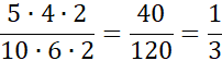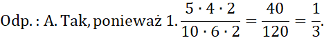Zwróć uwagę na to ile jest zdarzeń możliwych i ile sprzyjających. Zdarzenia możliwe uzyskasz z reguły mnożenia zdarzeń możliwych: liczba kul z cyframi 10 · liczba kul z literami 6 · kule z kolorami 2. Zdarzenia sprzyjające uzyskasz z reguły mnożenia: kula z liczbą parzystą 5 · kula ze spółgłoską 4 · kula kolorowa 2.