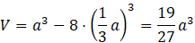 Objętość wielościanu jest równa objętości sześcianu minus 8 sześcianów o krawędzi