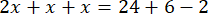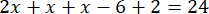 Jako x oznacz liczbę ocen dobrych. Ocen bardzo dobrych było 2 razy więcej (2x), a dostatecznych o 6 mniej niż dobrych (x – 6). Dwie osoby zdobyły oceny celujące. Wiedząc, że klasa liczy 24 osoby, ułóż równanie opisujące sumę wszystkich ocen. Następnie dodaj do siebie liczbę ocen dobrych i bardzo dobrych, aby obliczyć ich sumę.