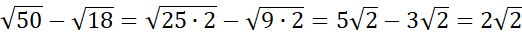 Liczbę pod każdym z pierwiastków zamień na taki iloczyn, w którym przynajmniej jeden czynnik jest kwadratem liczby całkowitej i zapisz jego przed pozostawioną liczbą pod pierwiastkiem. Na koniec oblicz różnicę powstałych pierwiastków.