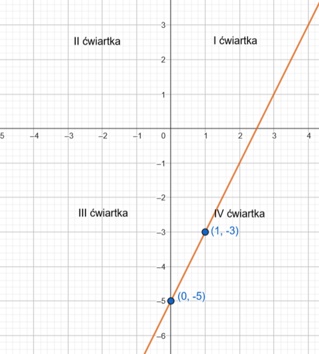 Uzyskane punkty zaznacz na wykresie i poprowadź prostą przechodzącą przez nie. Na koniec stal przez które ćwiartki przechodzi narysowany wykres