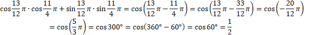 Zauważ, że wyrażenie to wzór na cosinus różnicy kątów. Przypomnij sobie, że