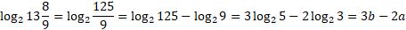 Zamień pierwszą liczbę logarytmowaną na ułamek niewłaściwy. Teraz rozpisz ułamek jako odejmowanie logarytmów o podstawie 2 i liczbach logarytmowanych 125 i 9.