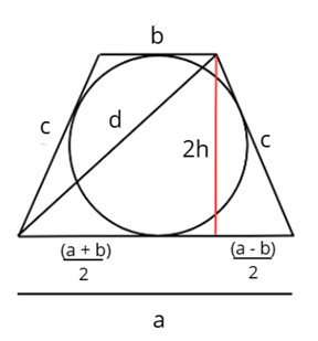 Wyznacz długości podstaw trapezu z twierdzenia Pitagorasa. Skorzystaj z warunku opisania czworokąta na okręgu, by obliczyć obwód trapezu.
