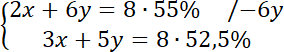 Ustal, jaka jest zawartość miedzi w każdym z tych stopów, jeśli są do dyspozycji dwa stopy miedzi różnej jej zawartości. Z 2 kg pierwszego i 6 kg drugiego otrzymano stop o zawartości 55% miedzi, zaś z 3 kg pierwszego i 5 kg drugiego otrzymano stop o zawartości 52,5% miedzi.