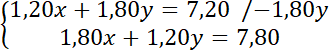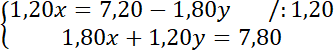 Ustal, ile jabłek ile bananów kupiła Krysia, jeśli na straganie można kupić banany i jabłka, jedno jabłko kosztuje 1,20 zł, a jeden banan 1,80 zł. Krysia kupiła kilka owoców i zapłaciła 7,20 zł. Piotr kupił tyle samo bananów, ile Krysia jabłek, i tyle jabłek, ile Krysia bananów, a za zakupy zapłacił 7,80 zł.