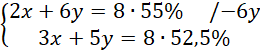 Ustal, jaka jest zawartość miedzi w każdym z tych stopów, jeśli są do dyspozycji dwa stopy miedzi różnej jej zawartości. Z 2 kg pierwszego i 6 kg drugiego otrzymano stop o zawartości 55% miedzi, zaś z 3 kg pierwszego i 5 kg drugiego otrzymano stop o zawartości 52,5% miedzi.