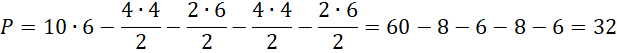 i ich część wspólną – równoległobok, którego pole musisz obliczyć. Zauważ, że aby to zrobić musisz od pola prostokąta o bokach 10 i 6 odjąć pola czterech trójkątów prostokątnych o przyprostokątnych odpowiednio: 4 i 4, 2 i 6, 4 i 4 oraz 2 i 6.