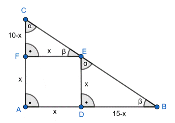 Wyznacz pole kwadratu ADEF, jeśli przyprostokątne trójkąta ABC przedstawionego na rysunku mają długość 10 i 15.