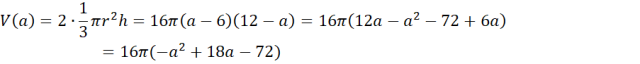 Z zależności długości promienia oraz wysokości wyznacz długość wysokości bryły, a następnie określ dziedzinę – wysokość i promień muszą być dodatnie. Następie z twierdzenia Pitagorasa wyznacz promień podstawy stożka i oblicz jego objętość – zauważ, że powstanie funkcja zmiennej