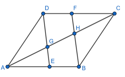 Udowodnij, że odcinki DE i FB dzielą przekątną AC na trzy odcinki równej długości, jeśli punkty E i F są środkami boków AB i DC równoległoboku ABCD.