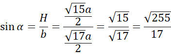 Skorzystaj z zależności podanej w treści zadania i z powstałego równania wyznacz długość wysokości ściany bocznej. Następnie skorzystaj z tego, że połowa krawędzi podstawy, wysokość ostrosłupa i wysokość ściany bocznej oraz połowa krawędzi podstawy, wysokość ściany bocznej i krawędź boczna tworzą trójkąt prostokątny. Dwukrotnie skorzystaj z twierdzenia Pitagorasa i wyznacz długość wysokości ostrosłupa oraz krawędzi bocznej. Na koniec oblicz sinus podanego kąta jako iloraz długości wyznaczonych odcinków.