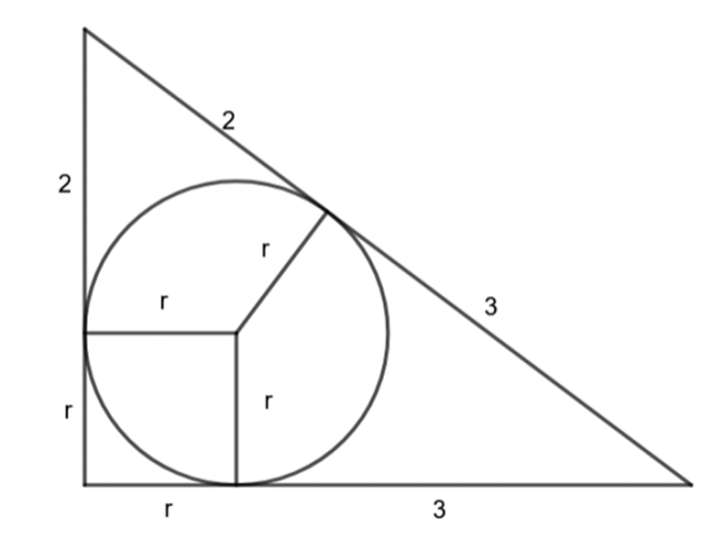 Wyznacz długości przyprostokątnych oraz promień okręgu wpisanego w ten trójkąt, jeśli w trójkąt prostokątny wpisano okrąg, a przeciwprostokątna została podzielona przez punkty styczności z okręgiem na odcinki o długościach 2 cm i 3 cm.