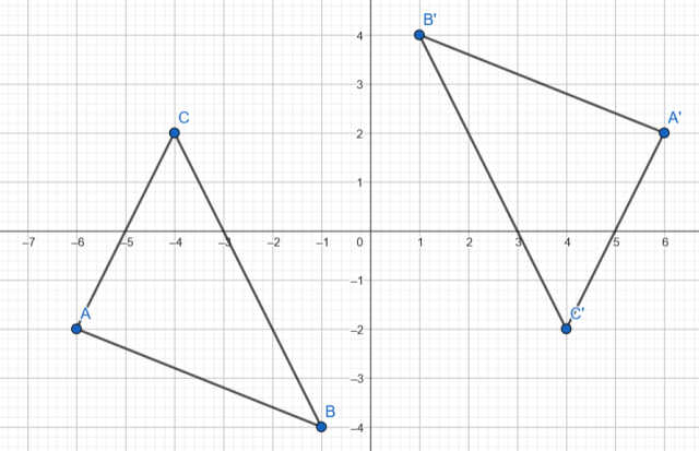 Skorzystaj z tego, że po odbiciu punktu względem początku układu współrzędnych każda z jego współrzędnych zmieni znak na przeciwny i na tej podstawie narysuj trójkąty ABC i A’B’C’ w jednym układzie współrzędnych.
