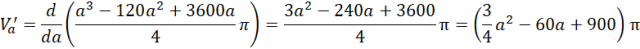Oznacz jeden z boków przekroju jako zmienną. Oblicz długość drugiego boku względem tej zmiennej i wyznacz przedział wartości. Podstaw otrzymane długości do wzoru na objętość walca. Miejsca zerowe pochodnej wyznaczonej funkcji wskazują na prawdopodobne ekstrema lokalne. Sprawdź, czy pochodna zmienia znak dla wyznaczonej wartości – masz wtedy do czynienia z ekstremum lokalnym. Oblicz objętość oraz pole powierzchni bocznej dla otrzymanych wartości, korzystając z odpowiednich wzorów.