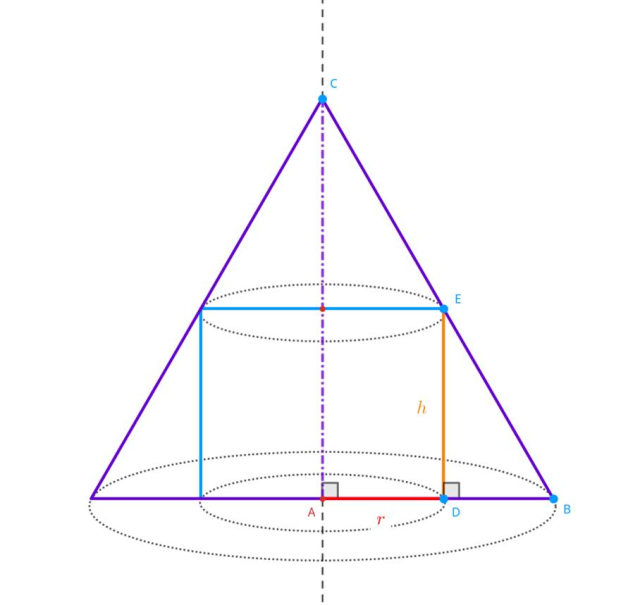 Opisz promień wpisanego walca jako 𝑟 i wysokość jako ℎ. Oblicz długość boku przekroju osiowego stożka: