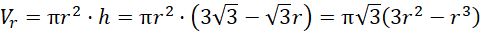 cm2. W bryłę wpisano walec w taki sposób, że jedna jego podstawa zawiera się w podstawie stożka, a druga podstawa jest styczna całym okręgiem do powierzchni bocznej stożka. Wskaż wzór opisujący objętość wpisanego walca w zależności od promienia jego podstawy.