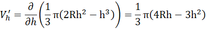 Pochodna to funkcja kwadratowa o ujemnym znaku współczynnika przy największej potędze. Otrzymane miejsce zerowe jest „po prawej stronie”, więc znak zmienia się z dodatniego na ujemny. Otrzymana wartość jest maksimum lokalnym funkcji objętości.