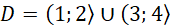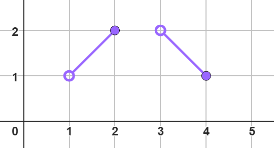Wystarczy narysować funkcję, która rozciąga się wzdłuż osi OX od wartości 1 do 2 włącznie i po przerwie od wartości 3 do 4 włącznie. Dodatkowo funkcja ta musi być zakończona punktami wypełnionymi w środku w najwyższym oraz najniższym punkcie. Może to być na przykład: