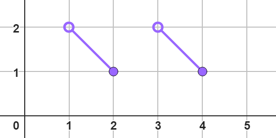 Wystarczy narysować funkcję, która rozciąga się wzdłuż osi OX od wartości 1 do 2 włącznie i po przerwie od wartości 3 do 4 włącznie. Dodatkowo funkcja ta musi być zakończona punktem wypełnionym w środku w najniższym punkcie oraz punktem pustym w środku w najwyższym punkcie. Może to być na przykład:
