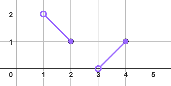 Wystarczy narysować funkcję, która rozciąga się wzdłuż osi OX od wartości 1 do 2 włącznie i po przerwie od wartości 3 do 4 włącznie. Dodatkowo funkcja ta musi być zakończona punktem pustym w środku w najniższym oraz najwyższym punkcie. Może to być na przykład: