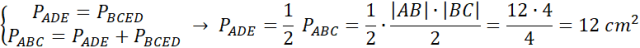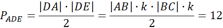 Wiemy, że pola figur ADE oraz BCED są sobie równe, oraz ich suma równa się polu trójkąta ABC, możemy więc zapisać: