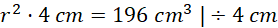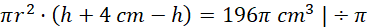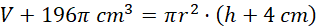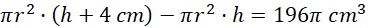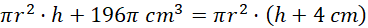 Wyznacz promień podstawy pewnego walca wiedząc, że jego objętość zwiększy się o 196π cm3 przy zwiększeniu jego wysokości o 4 cm.