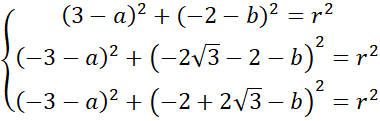 to jego promień. Podane punkty podstaw pod ten wzór. Zauważ, że powstanie układ trzech równań z trzema niewiadomymi, rozwiąż go i zapisz szukane równanie okręgu.