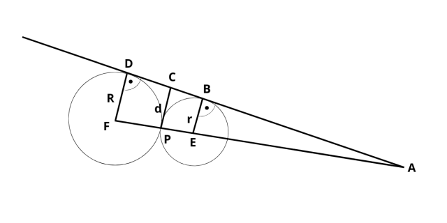 Dwa okręgi są styczne zewnętrznie, ich promienie to 3 cm oraz 4,5 cm. Prowadzimy styczną do obu okręgów oraz prostą przechodzącą przez środki tych okręgów. Punkt styczności nazywamy punktem P. Oblicz odległość punktu P od stycznej.