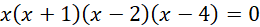 Równanie jest już w postaci rozłożonej na czynniki pierwsze. Z poszczególnych nawiasów można odczytać, że pierwiastkami równania są 0, –1, 2 oraz 4.