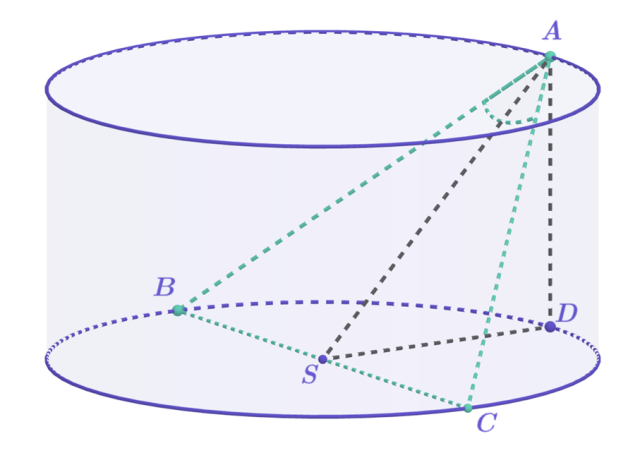 Wykonaj odpowiedni rysunek pomocniczy. Zwróć uwagę, że punkt A leży na okręgu, a średnica BC jest prostopadła do płaszczyzny utworzonej przez punkt A i oś walca.
