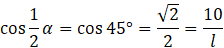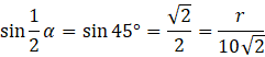 Jeśli kąt α = 90º, a wysokość stożka to ℎ = 10, to znając te wartości możesz wyznaczyć długość tworzącej stożka. Zauważ, że kąt pomiędzy wysokością o tworzącą jest równy połowie kąta α, a jego cosinus o znanej wartości to stosunek długości wysokości ostrosłupa do długości tworzącej. Następnie wyznaczasz długość promienia: stosunek długości promienia do tworzącej stożka to sinus połowy kąta rozwarcia, którego wartość możesz sprawdzić w tabeli.