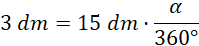 Dany jest stożek o długości jego tworzącej l = 15 dm oraz promieniu podstawy r = 3 dm. Rozpatrz wycinek koła powstałego z powierzchni bocznej bryły i znajdź jego kąt środkowy.