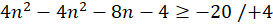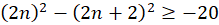 Zauważ, że dwie następujące po sobie liczby naturalne parzyste to 2n i 2n + 2. Różnica kwadratu liczby naturalnej parzystej i kwadratu następnej po niej liczby parzystej jest większa lub równa -20 to nierówność: