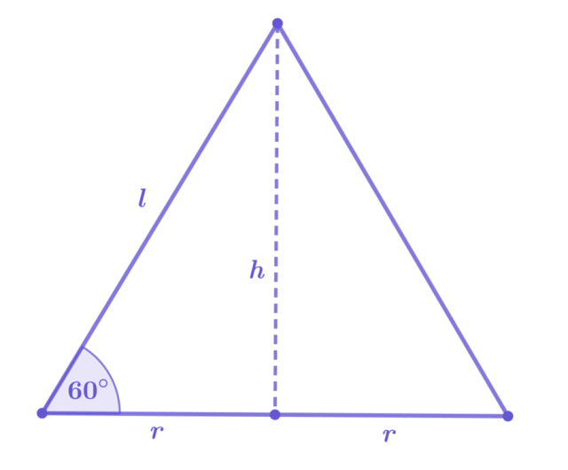 Stwórz rysunek pomocniczy z przekrojem stożka. Korzystając z funkcji trygonometrycznych uzależnij tworzącą stożka od promienia.