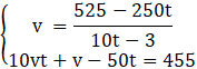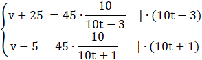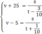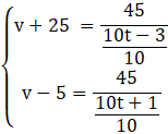 Pociąg podróżuje między miastami A i B, które są odległe o 45 km, z wykorzystaniem średniej prędkości v. Gdyby pociąg podróżował z prędkością większą o 25 km/h, dotarłby do miasta B 18 minut wcześniej niż w przypadku swojej średniej prędkości. Natomiast gdyby podróżował z prędkością mniejszą o 5 km/h, dotarłby do miasta B 6 minut później niż w przypadku swojej średniej prędkości. Musisz obliczyć prędkość v pociągu.