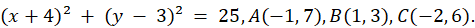 Dane jest równanie okręgu oraz punkty A, B, C. W tym zadaniu musisz sprawdzić algebraicznie, które z tych punktów należą do okręgu. Następnie musisz narysować okrąg w układzie współrzędnych i zaznacz punkty A, B, C.