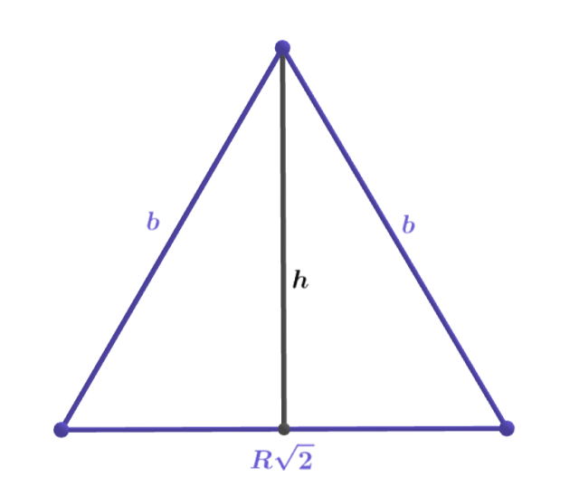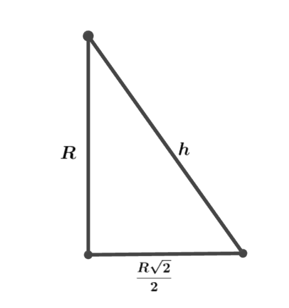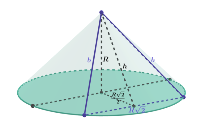 Dany jest stożek o promieniu podstawy i wysokości wynoszącym R. Rozpatrz przekrój tego stożka będący trójkątem o wierzchołku w wierzchołku stożka oraz podstawie będącej cięciwie odpowiadającej prostemu kątowi środkowemu w podstawie stożka. Wyznacz jego pole.