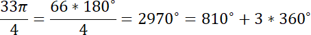 Musimy przekształcić miarę kąta z radianów na stopnie. W tym celu mnożymy podaną miarę przez