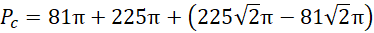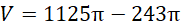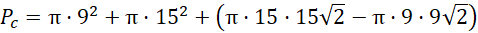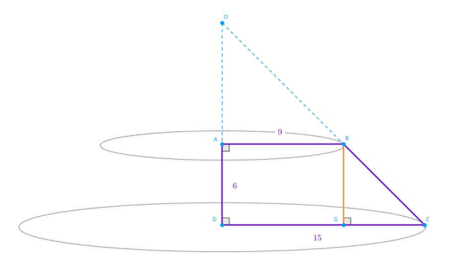 Dany jest pewien trapez prostokątny o podstawach długości 15 i 9 oraz kącie ostrym o mierze 45°. Bryłę obrotową utworzono, obracając figurę wokół najkrótszego boku. Oblicz objętość oraz pole powierzchni całkowitej utworzonej bryły.