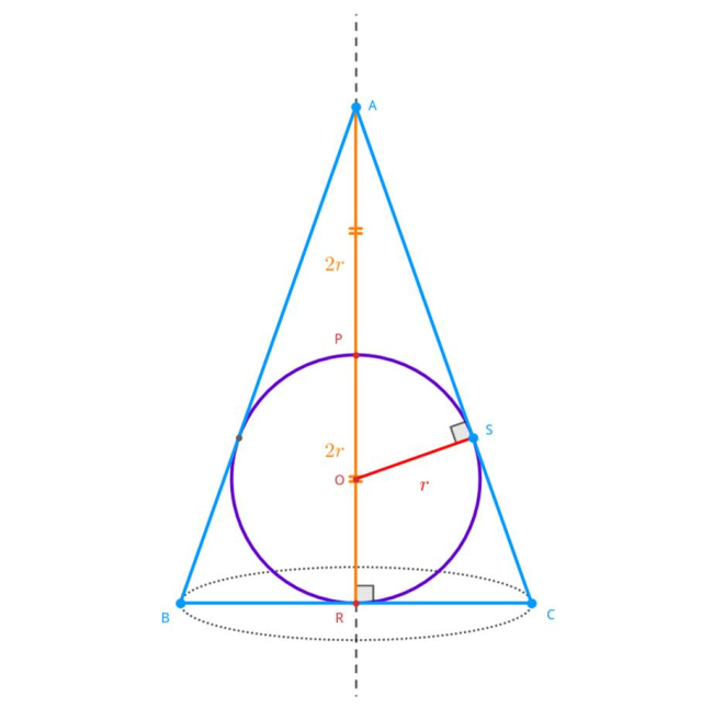 Udowodnij, że pole powierzchni stożka opisanego na kuli w taki sposób, że jego wysokość jest dwa razy większa od średnicy kuli, jest dwa razy większe od pola powierzchni kuli.