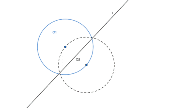 , aby był środek symetrii. Jako, że ma być środek sumy figur, w tym również prostej zauważ, że musi on leżeć na prostej. Narysuj zatem okrąg o takim samym promieniu z symetrycznym środkiem względem prostej.
