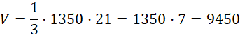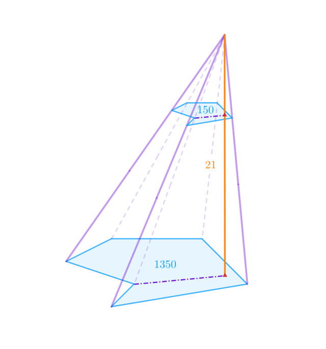 O pewnym ostrosłupie wiadomo, że jego wysokość jest równa 21 cm, a pole podstawy wynosi 1350 cm2. Przez bryłę przeprowadzono płaszczyznę równoległą do płaszczyzny podstawy, która tworzy w bryle przekrój o polu 150 cm2. Oblicz objętość mniejszego ostrosłupa.