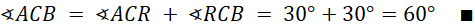 Skoro trójkąty są podobne, to kąt OCG również ma miarę 30°. Ponieważ trójkąty są przystające, to miara kąta ACB to suma miar kątów ACR i RCB. A to daje: