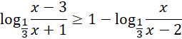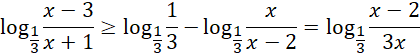 W pierwszej kolejności rozpisujemy założenia, mianowniki nie mogą być równe zero oraz liczby logarytmowane nie mogą być mniejsze bądź równe 0. Następnie sprowadzamy prawą stroną nierówności do postaci logarytm z wyrażenia, poprzez sprowadzanie 1 do logarytmu o podstawie