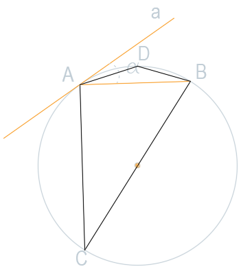 Znajdź miarę kąta rozwartego opartego na AB i wpisanego w okrąg, jeśli kąt między prostą a cięciwą AB wynosi α, a prosta a jest styczna do okręgu.